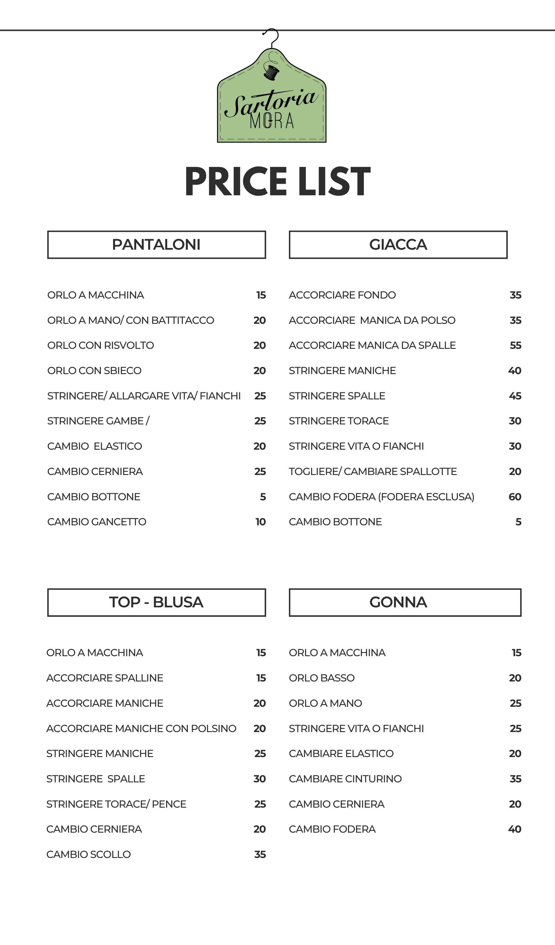 I prezzi riportati nel listino si riferiscono al costo minimo per la lavorazione e sono calcolati considerando capi "standard". Tuttavia, alcuni capi sono considerati speciali, il che potrebbe comportare un aumento dei prezzi a seconda di alcune variabili, come ad esempio: